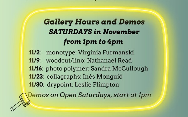 Leslie Plimpton for a great demo showing us how you go about using drypoint and hand coloring to create your beautiful prints. We all learned a lot. There are two more Saturday demos and open gallery hours. Saturday 11/22 & 11/29 from 1-4pm. Hope you can stop by to see the inkspots annual exhibit as... Continue Reading →
