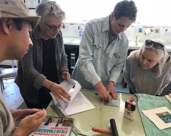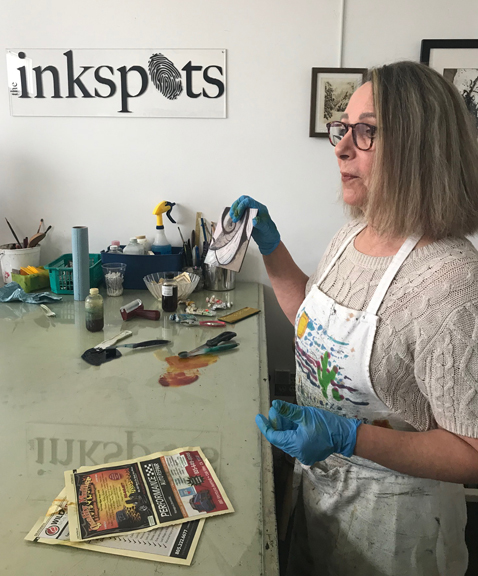 Our first Saturday printmaking demonstration by inkspot member Inés Monguió. She brought samples of her collagraph plates and demonstrated different types of inking and printing. One lucky visitor received one of her prints. Come back next Saturday, see the show and another printmaking demonstration, next week it will be screen printing by Most.